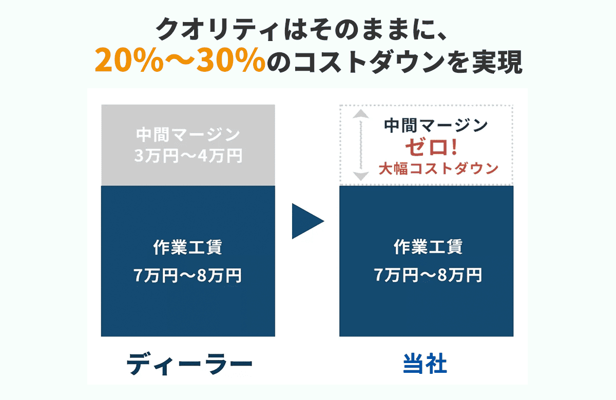 作業自体を下請けの整備工場やガラス工場に依頼する他店では、中間マージンが発生することがあります。当店は施工まで一貫して対応するので、その分お安くなります!